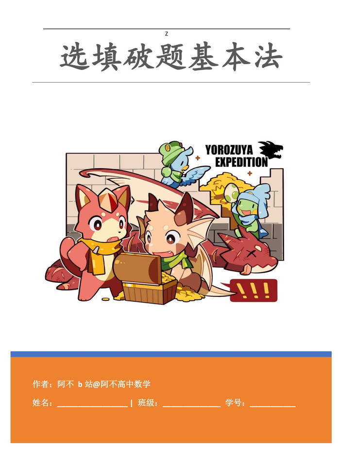 《选填破题基本法》(原名《解题基本法》)是 B 站知名高中数学 UP 主阿不(刘子不) 推出的,针对高考数学选择题与填空题的方法讲义 / 配套资料(非传统纸质书,核心为课程讲义)。 解决高中数学选填题 “做得慢、没思路、不会巧解”的痛点,帮助学生快速找到破题点,提升解题速度与正确率,节省考试时间。