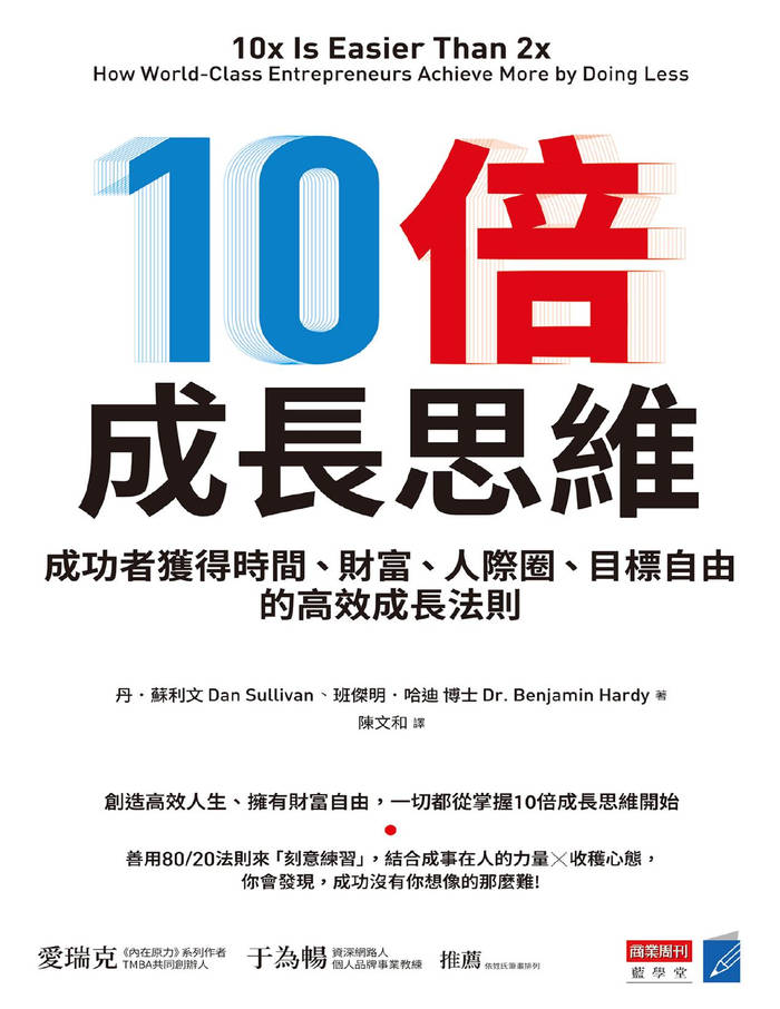 10倍成长思维也是改变自己和生活的工具,带你踏上一段有如剥洋葱的旅程,一层一层发现自己的天赋,展现真实的你:10倍成长思维打破“付出2倍努力比花10倍努力更容易”的迷思→实际结果恰恰相反! 10 倍成长思维需要消除 80% 阻碍你前进的现有客户、角色、行为和心态,因此你的成功路径更明确,花费力气更少。
