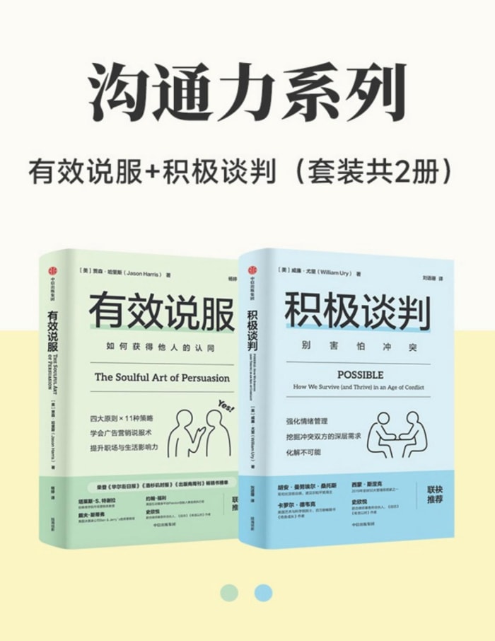“沟通力系列”:化解冲突,职场提升。本套装包括《有效说服》《积极谈判》。《有效说服》如今,不论是在销售、营销、提案、商业管理、沟通、合作中,还是在政治游说、公共事务讨论中,都须具备说服力,而良好的说服力,靠的是让人心服口服的影响力,而非诡辩话术、威胁恐吓。比起话术,人们更在意真诚。你必须成为一个值得信任,有时候甚至让人感动的人。