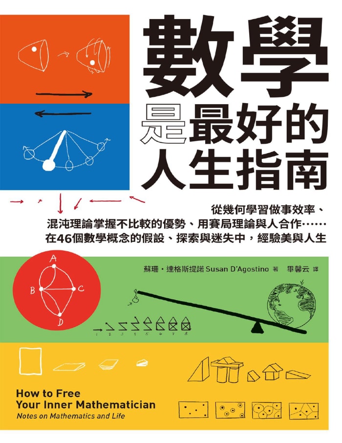 你手上的這本書,就將透過46個數學概念,帶你看見數學與生活的連結。閱讀時,你無須使用複雜的公式,只需要思考,並且經歷思考數學時帶給你的一切──你會發現自己在數學裡是自由、勇敢、能欣賞美且充滿彈性的。這可能是你的本質,也可能是數學給你的,就像我們也分不清楚究竟是生活裡有數學,還是我們就活在數學裡。但是這些不重要,重要的是,透過書中的引導,你會漸漸將數學放進心裡,處處留意它,令你更能擁抱改變,相信自己,也對世界抱有更大的好奇心,重新意識到那些你過去不曾察覺的意義與美麗。