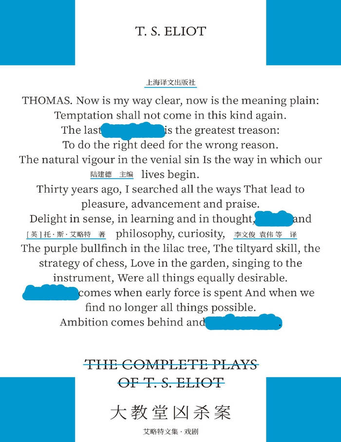 作者简介:托·斯·艾略特(T.S.Eliot,1888-1965)诗人、剧作家和文学批评家,诗歌现代派运动领袖。出生于美国密苏里州的圣路易斯。一九二二年发表的《荒原》为他赢得了国际声誉,被评论界视为二十世纪最有影响力的一部诗作,至今仍被认为是英美现代诗歌的里程碑。一九二七年加入英国国籍。一九四三年出版的《四首四重奏》为他赢得诺贝尔文学奖,并确立其在世最伟大英语诗人和作家的地位。晚年致力于诗剧创作,一九六五年在伦敦逝世。