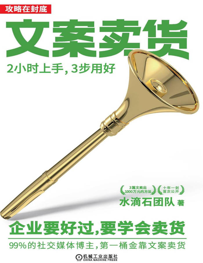水滴石团队依靠这套方法,曾创造3篇文案卖出1000多万元销售额的纪录。水滴石团队十年磨练,首次公开。一个案例逐字逐句揭秘,3篇文卖出1000万元的方法,从战略到货架,全流程让企业卖得更多、更快、更贵、更久的2种方法、10个重点、14个疑难。跟着步骤走,2小时上手,3步用好。